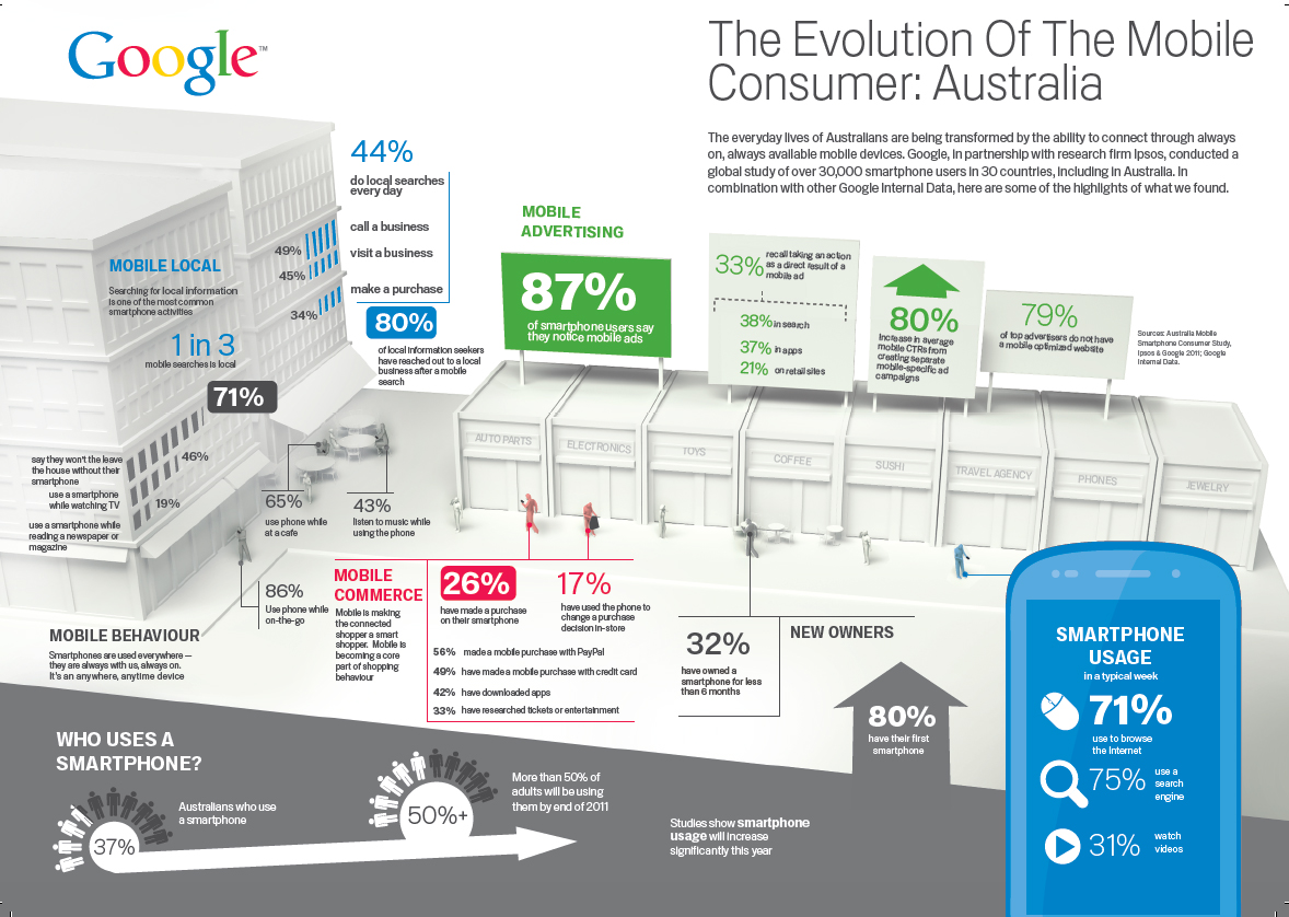 A study by Google has shown that by the end of 2011 50% of Australians will own a SmartPhone (be it an iPhone, Android or Windows 7 Phone). One of the most common uses for SmartPhone is researching businesses on the internet in order to call the business, get information or make online purchases. People are on their phones, anywhere and any time which means they could be looking for your website on their SmartPhone after seeing an advertisement, whilst in a store looking at your products or perhaps when discussing your product when out with friends.